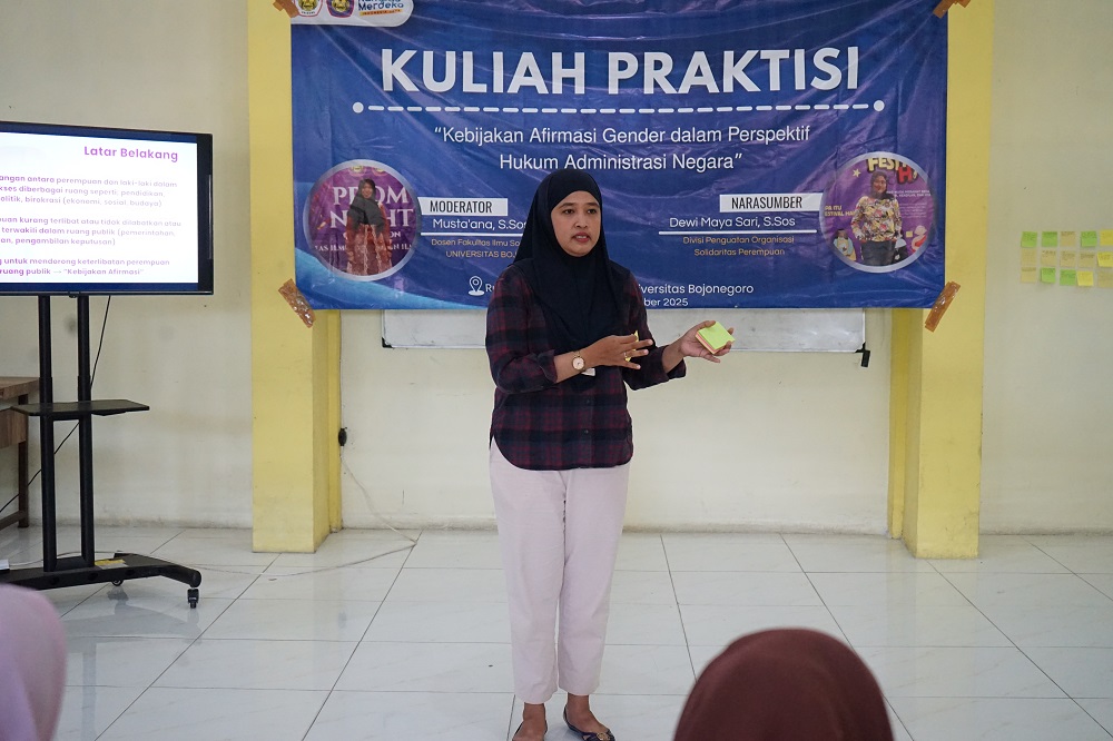 BOJONEGORO – Prodi Administrasi Publik Universitas Bojonegoro (Unigoro) menggelar kuliah praktisi di Gedung Fakultas Ilmu Sosial dan Ilmu Politik (FISIP) Unigoro, Jumat (31/11/25). Kuliah praktisi kali ini menghadirkan Dewi Maya Sari, S.Sos., selaku divisi penguatan organisasi Solidaritas Perempuan. Untuk membahas Read more