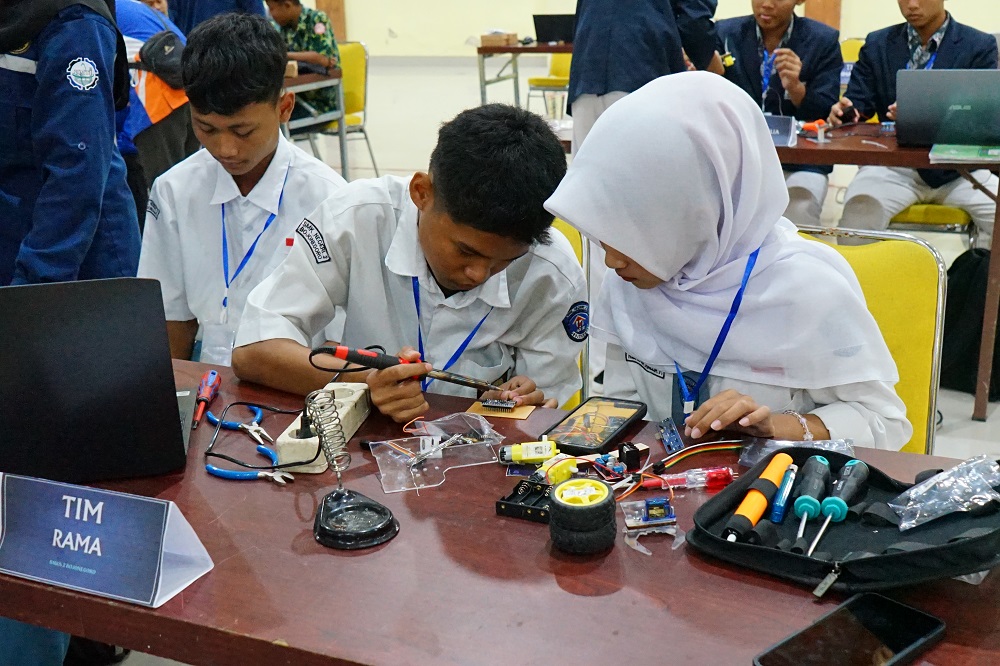 SERIUS: Puluhan pelajar tampak berjibaku di solder dan komponen elektronika lainnya di event Unigoro Robotic Challenge 2026, Selasa (21/4/26).