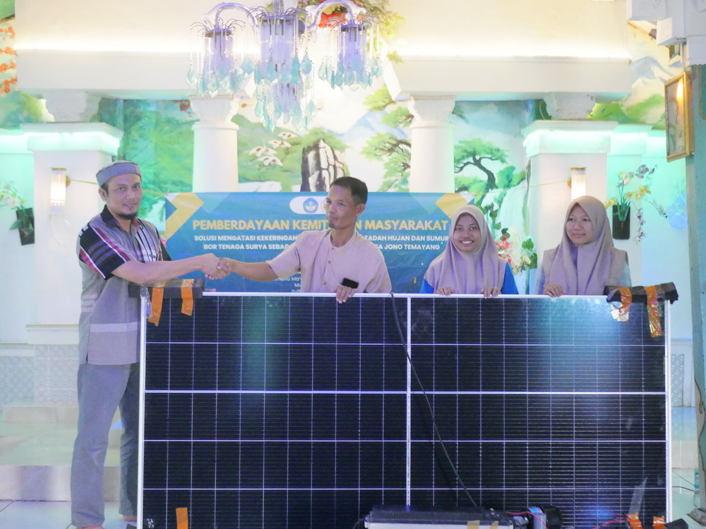 PANEL SURYA: Amalia Ma’rifatul M., S.Si., MT., bersama Zuffa Anisa, S.Pd., M.Si. dan Mushtofa, ST., MT., menyerahkan eknologi tadah hujan dan sumur bor tenaga surya kepada petani Desa Jono, Temayang, Bojonegoro.