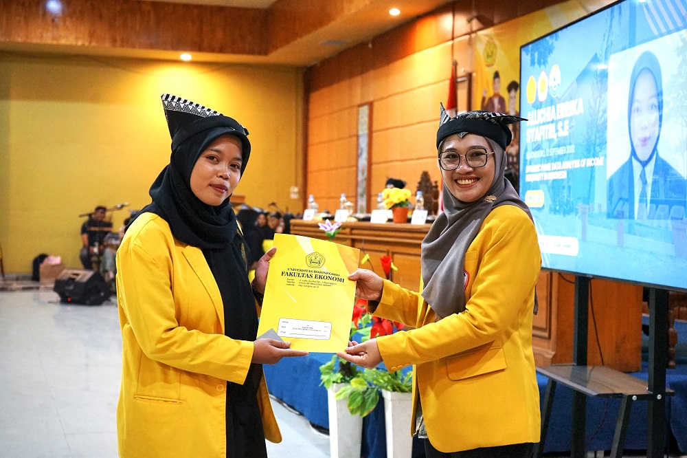 Yudisium Fakultas Ekonomi Unigoro ditandai dengan penyerahan surat keterangan lulus (SKL) dan transkrip nilai oleh Kaprodi Ekonomi Pembangunan. Dekan Fakultas Ekonomi Unigoro, Endang, SE., MM., mengucapkan selamat atas keberhasilan mahasiswa prodi ekonomi pembangunan yang merampungkan studi selama delapan semester. “Semuanya sudah melalui proses mengerjakan skripsi dan publikasi jurnal SINTA 2 dengan luar biasa. Terima kasih atas prestasi yang telah diukir karena turut menyukseskan akreditasi prodi hingga mendapatkan predikat Baik Sekali. Teruslah mengasah kemampuan yang tidak bisa dilakukan oleh AI (artificial intelligence). Simpati, integritas, dan prestasi,” ucapnya.