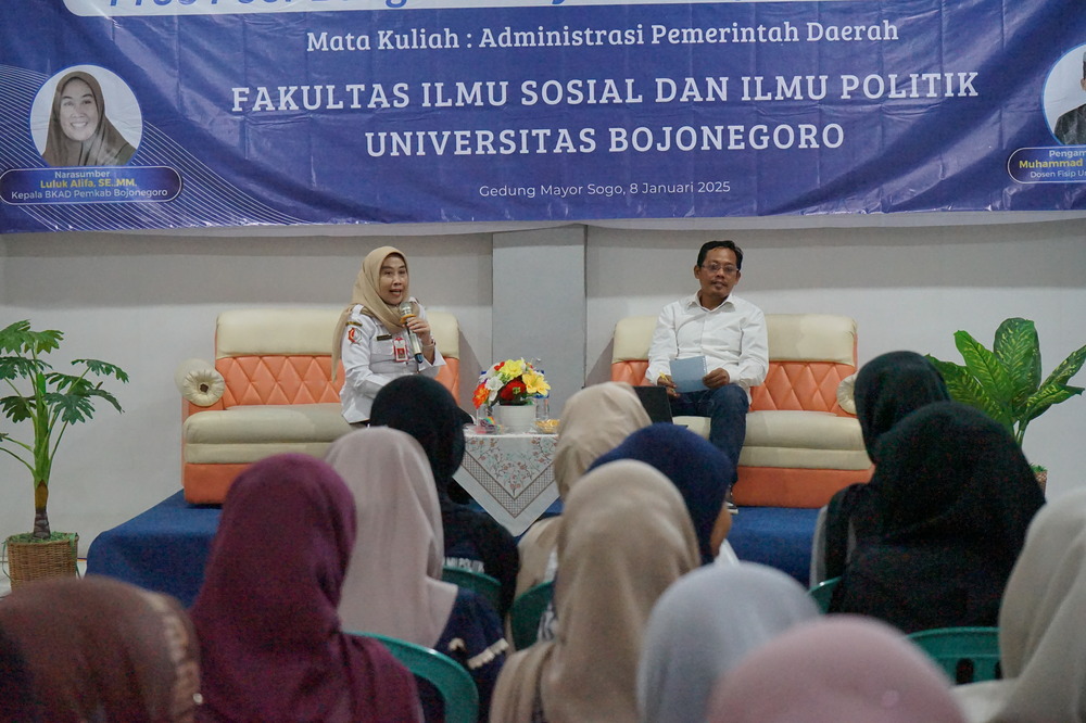 BOJONEGORO – Prodi administrasi publik Universitas Bojonegoro (Unigoro) menggelar kuliah praktisi di Gedung Mayor Sogo Unigoro, Rabu (8/1/25). Kuliah praktisi kali ini bertema pro-poor budget policy. Prodi tersebut menghadirkan Luluk Alifah, SE., MM., selaku Kepala Badan Pengelola Keuangan dan Aset Daerah (BPKAD) Bojonegoro sebagai dosen praktisi.