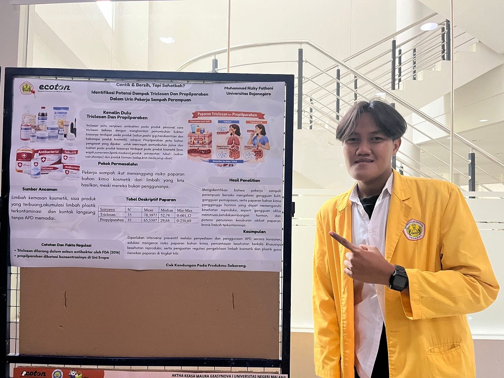 Rizky menuturkan, risetnya tentang Identifikasi Potensi Dampak Triclosan dan Propilparaben dalam Urin Pekerja Sampah Perempuan berawal dari tugas yang diberikan saat menjalani praktik kerja lapangan (PKL) di ECOTON Indonesia. Penelitian tersebut berfokus pada solusi untuk menekan risiko paparan plastik terhadap kesehatan manusia. “Saya meneliti kadungan zat kimia berbahaya dalam urine yang dihasilkan dari paparan limbah plastik. Nah, ternyata di dalam urine tersebut ada senyawa triclosan dan propilparaben. Bahan kimia itu biasanya ada di kosmetik dan skincare yang dibuang. Hingga akhirnya terakumulasi dengan senyawa lain,” tuturnya, Selasa (10/3/26).