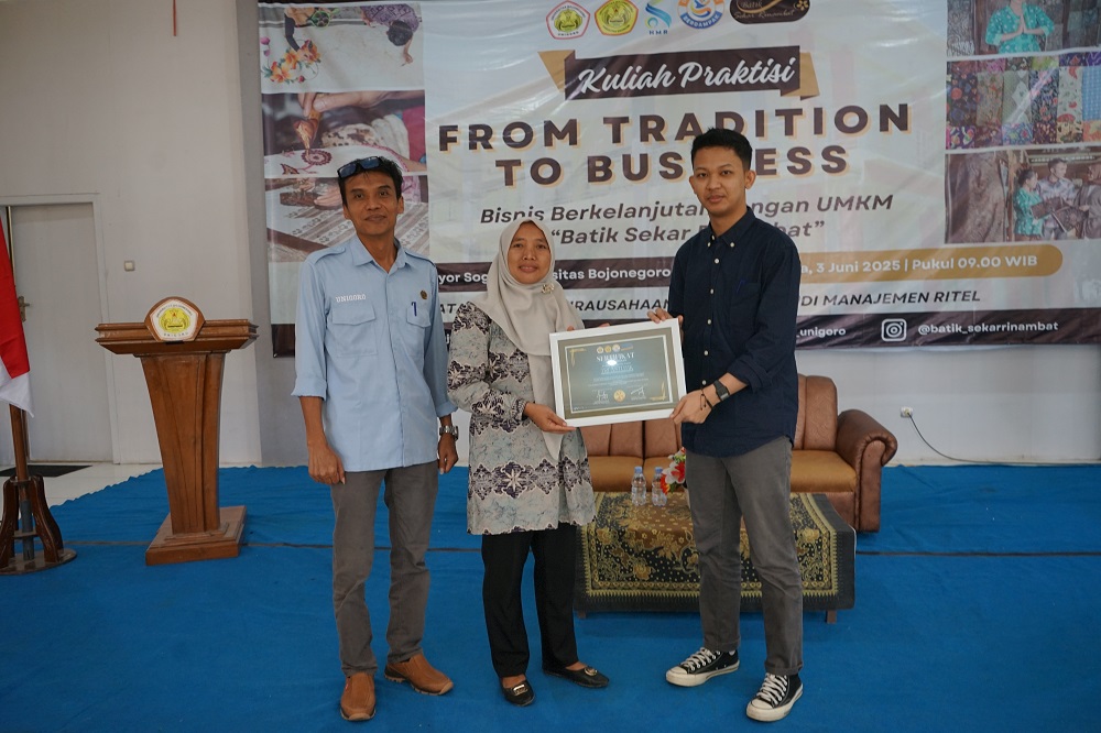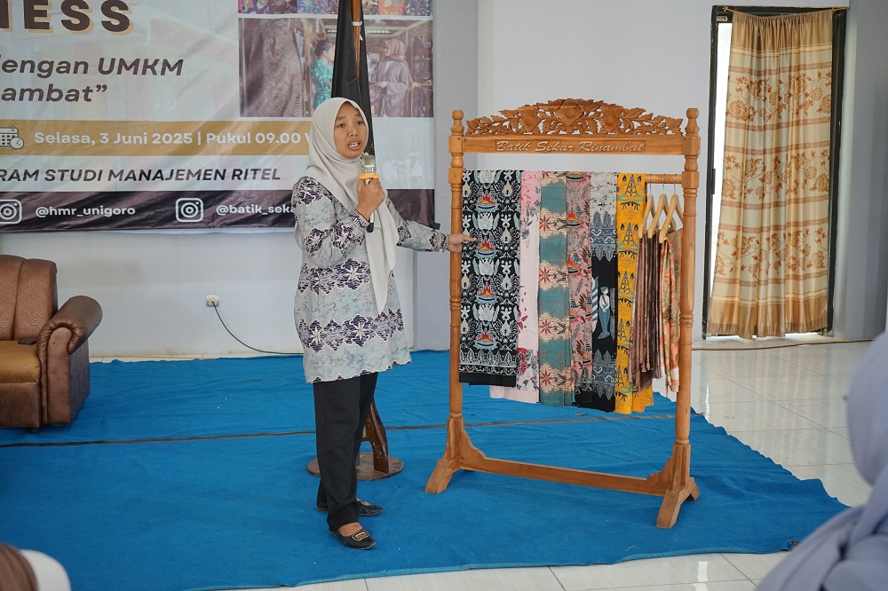 APRESIASI: Kaprodi dan Dosen Manajemen Ritel Unigoro memberikan apresiasi kepada owner Batik Sekar Rinambat, Selasa (3/6/25).