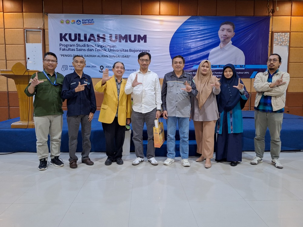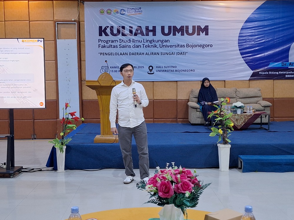 BOJONEGORO – Prodi ilmu lingkungan Universitas Bojonegoro (Unigoro) menggelar kuliah umum di Hall Suyitno Unigoro, Kamis (30/1/25). Kuliah umum kali ini mengupas pengelolaan daerah aliran sungai (DAS). Prodi tersebut menghadirkan Dr. Arbor Reseda, ST., MT., selaku Kabid Keterpaduan Pembangunan Infrastruktur (KPI) BBWS Bengawan Solo.