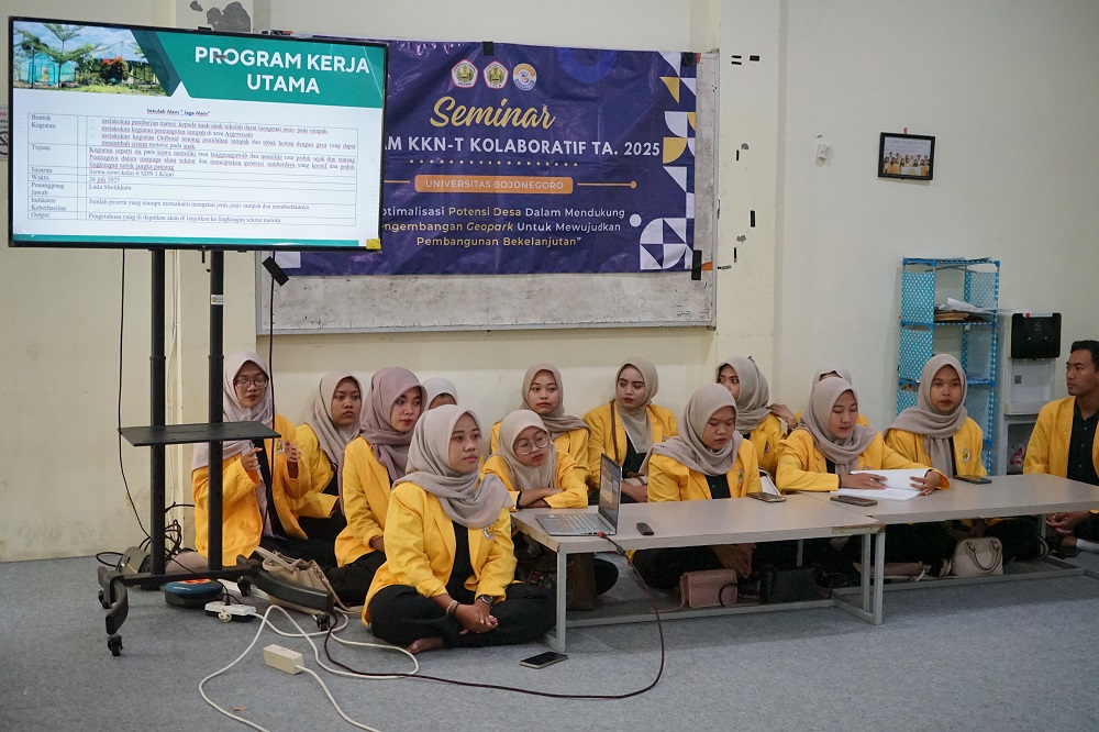 BOJONEGORO – Lembaga Penelitian dan Pengabdian Masyarakat (LPPM) Universitas Bojonegoro (Unigoro) menggelar ujian laporan hasil pelaksanaan Kuliah Kerja Nyata Tematik Kolaboratif (KKN TK) Unigoro 2025, Jumat (29/8/25). Para peserta wajib memaparkan capaian hasil program kerja selama melakukan pengabdian di 28 titik lokasi geosite, biosite, dan culture site. LPPM Unigoro melibatkan pejabat struktural internal serta perwakilan Badan Perencanaan Pembangunan Daerah (Bappeda) serta Dinas Kebudayaan dan Pariwisata (Disbudpar) Bojonegoro sebagai penguji.