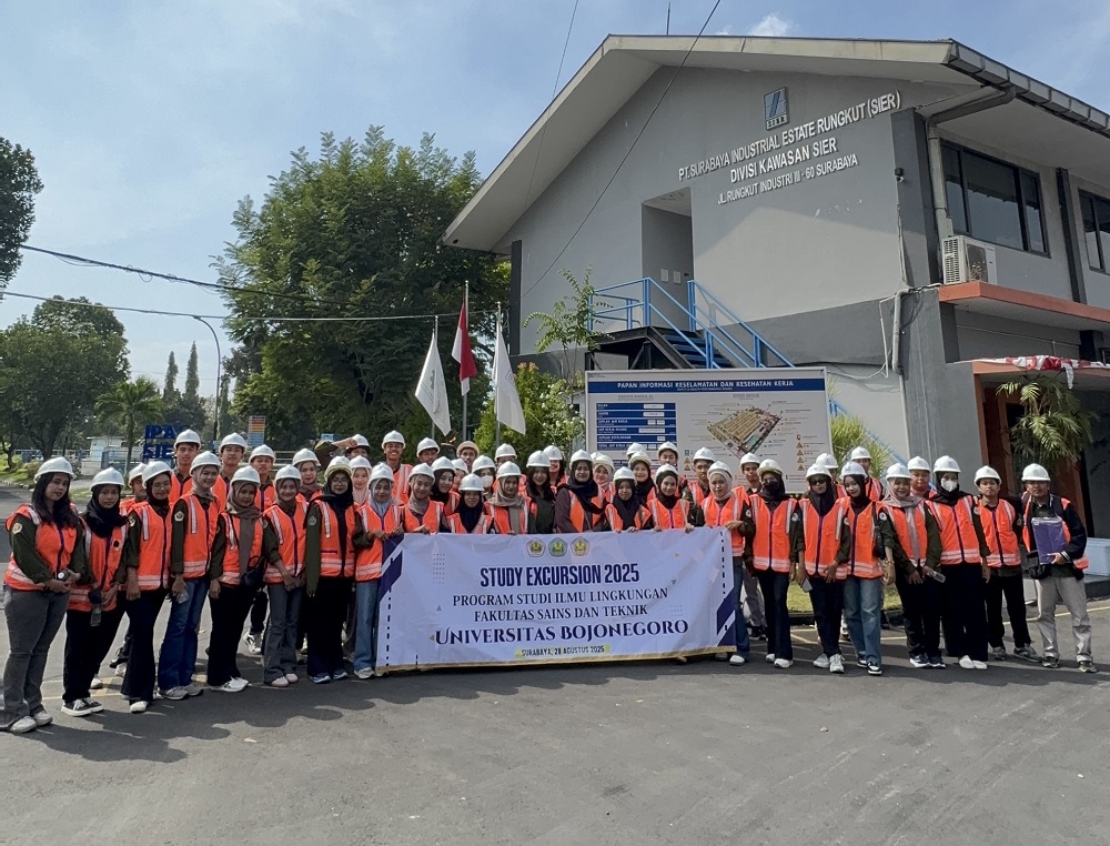 BOJONEGORO – Seluruh mahasiswa dan dosen prodi Ilmu Lingkungan Universitas Bojonegoro (Unigoro) melaksanakan studi ekskursi di PT. Surabaya Industrial Estate Rungkut (SIER), Kamis (28/8/25). Pada kesempatan ini, mahasiswa dapat melihat secara langsung aplikasi teori sistem pengelolaan lingkungan yang dipelajari di kelas. Khususnya pada aspek pengolahan limbah cair industri. Sekaligus membangun jejaring praktisi di lapangan.