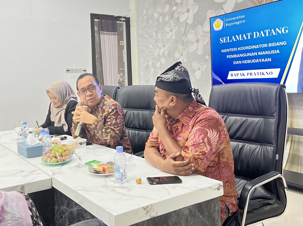 INTERAKTIF: Menko PMK RI, Pratikno, berdiskusi dengan Rektor Unigoro dan Ketua Yayasan Suyitno Bojonegoro, di ruang Adu Ide Rektorat Unigoro, Rabu (27/2/25).
