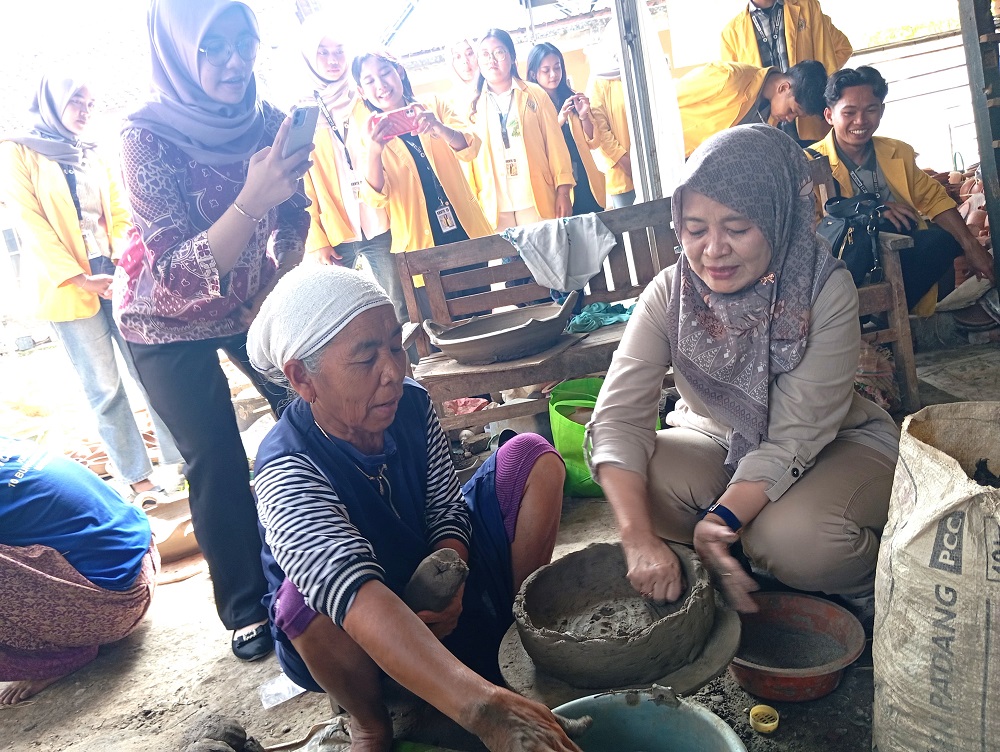 BUTUH KETERAMPILAN KHUSUS: Rektor Unigoro mencoba membuat kerajinan gerabah di Desa Rendeng, Kecamatan Malo, Rabu (30/7/25).