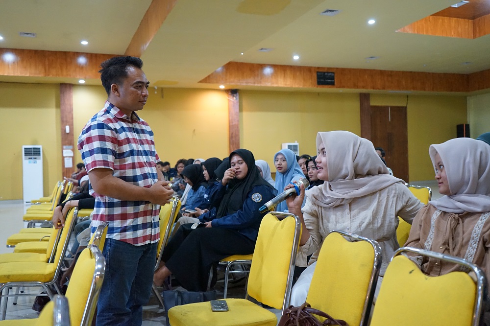 Mahasiswa prodi manajemen ritel Unigoro tampak antusias dengan topik kuliah praktisi kali ini. Mereka memanfaatkan momen diskusi untuk menjawab rasa penasarannya terkait bisnis franchise langsung dengan sang owner. (din)