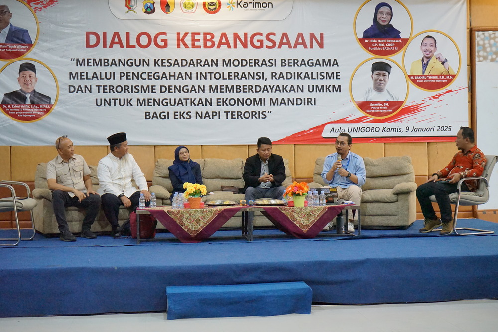 BOJONEGORO – Paguyuban Karimon yang berisi eks napi teroris asal Bojonegoro berkolaborasi dengan Densus 88 Anti Teror Satgaswil Jatim menggelar seminar kebangsaan di Hall Suyitno Universitas Bojonegoro (Unigoro), Kamis (9/1/25). Seminar yang bertujuan membangun moderasi beragama melalui pencegahan intoleransi, radikalisme, dan terorisme ini menghadirkan sejumlah pegiat. Di antaranya Kompol Dr. Dani Teguh Wibowo dari Densus 88 Anti Teror Satgaswil Jatim, Dr. Rida Hesti Ratnasari dari Pusdiklat Baznas RI sekaligus pengamat gerakan HTI, Dr. H. Zainal Arifin dari Kantor Kemenag Bojonegoro seklaigus Ketua Pokja Moderasi Beragama Bojonegoro, Ustad Azhari Dipo Kusumo selaku eks Jamaah Islamiyah dan Kombatan Morro-Syiria, serta M. Bakhru Thohir M.Si., selaku dosen Unigoro sekaligus anggota jaringan Gusdurian.