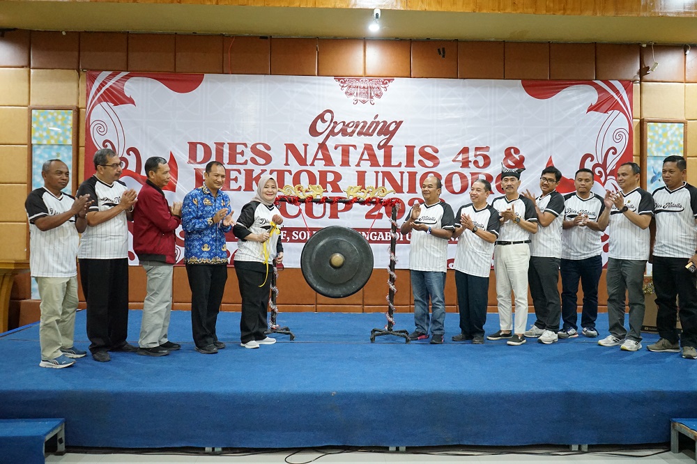BOJONEGORO –  Peringatan Dies Natalis Universitas Bojonegoro (Unigoro) ke 45 tahun akan tak ada habisnya. Kejuaraan Rektor Unigoro Cup 2026 se Jawa Timur resmi dibuka oleh Kepala Dinas Pemuda dan Olahraga (Dinpora) Bojonegoro, Rektor Unigoro, serta Ketua Yayasan Suyitno Bojonegoro di Hall Suyitno, Jumat (17/4/26). Momen grand opening ini juga dihadiri perwakilan lembaga SMA/SMK/MA Bojonegoro dan Tuban.