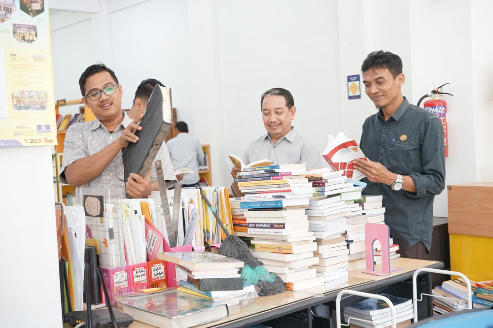 LITERATUR HUKUM: Para pejabat struktural Unigoro membaca buku-buku hibah dari Freddy Poernomo.
