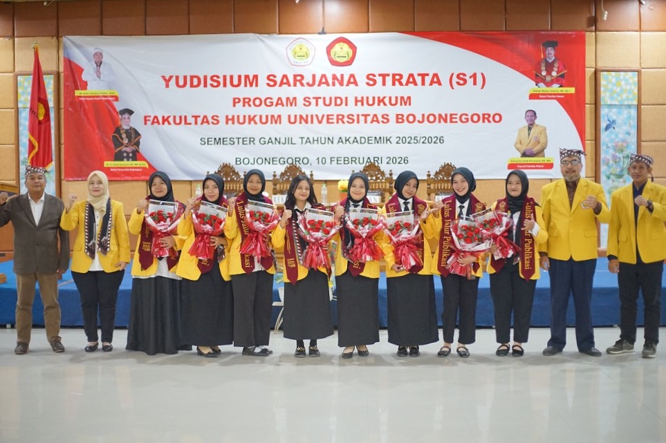 BOJONEGORO – Fakultas Hukum (Unigoro) menggelar Yudisium Sarjana Strata 1 (S-1) Prodi Hukum Semester Ganjil Tahun Akademik 2025/2026 di Hall Suyitno Unigoro, Selasa (10/2/26). 40 mahasiswa dinyatakan lulus dan resmi menyandang gelar sebagai sarjana hukum (SH). Mereka berhasil menuntaskan studinya dengan durasi tujuh semester atau 3,5 tahun.