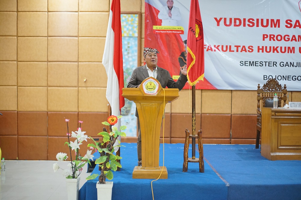 Yudisium Fakultas Hukum Unigoro ditandai dengan penyerahan surat keterangan lulus (SKL) dan transkrip nilai. Dekan Fakultas Hukum Unigoro, H. Didiek Wahyu Indarta, SH., S.P-1., mengucapkan selamat kepada para mahasiswa yang telah menyelesaikan studinya dengan tepat waktu. Terlebih, delapan peserta yudisium merupakan mahasiswa yang lulus jalur publikasi di jurnal SINTA 2 dan SINTA 3. “Yudisium hanyalah momen pengukuhan mahasiswa yang telah menuntaskan perkuliahan dan berhak menyandang gelar sarjana. Namun lebih dari itu, masyarakat juga menunggu pengabdian dan ilmu-ilmu yang didapatkan saudara saat kuliah,” harapnya.