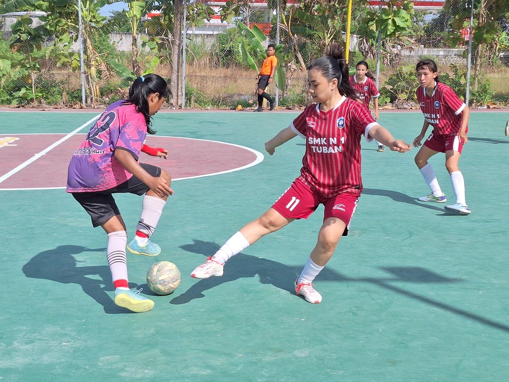 DUEL SENGIT: Striker SMKN 1 Tuban (jersey merah) mencoba merebut bola dari pemain SMA Kemala Bhayangkari 3 Porong Sidoarjo (jersey ungu) dalam babak semifinal futsal putri Rektor Unigoro Cup 2025, Senin (28/4/25).