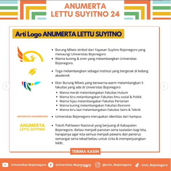 Humas Unigoro, Sofia Aldania B., S.T.P., menerangkan, nama kegiatan PKKMB tahun ini adalah Anumerta Lettu Suyitno. Nama pahlawan tersebut dipilih karena memiliki nilai historis yang erat kaitannya dengan Unigoro. “Anumerta Lettu Suyitno adalah pahlawan nasional yang berjuang di Kabupaten Bojonegoro. Kami ingin civitas akademika Universitas Bojonegoro meneladani semangat dan tekad beliau dalam memperjuangkan NKRI. Selain itu fakta uniknya, Unigoro terletak di Jalan Lettu Suyitno dan berada di bawah naungan Yayasan Suyitno Bojonegoro. Jadi banyak value positifnya untuk kami,” terangnya pada Kamis (5/9/24).